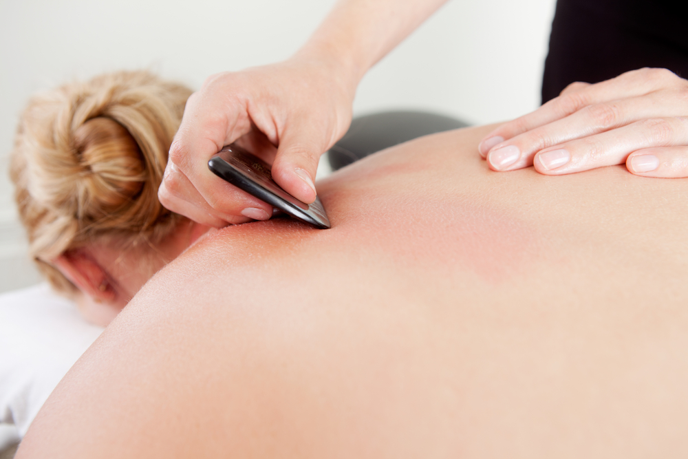 Gua Sha besteht aus wiederholtem Schaben auf eingeölter Haut mit einer abgerundeten Kante. Üblicherweise werden abgerundete Tierhörner oder Jade verwendet. Die abgerundete Kante wird auf die eingeölte Haut gedrückt und entlang der Muskeln oder der Meridiane in ca. 10 bis 15 cm langen Zügen bewegt. Dieses Verfahren verursacht eine verstärkte Durchblutung (Sha) in der Haut, wobei auch Petechien und Ekchymosen entstehen. Es dauert normalerweife 2 bis 4 Tage, bis diese wieder verschwinden. Je starker die „Blutstrasse" (im Sinne der chinesischen Medizin) ist, desto stärker verfärbt sich die Haut. Typischerweise verspüren Patienten sofort eine Erleichterung und Veränderung.